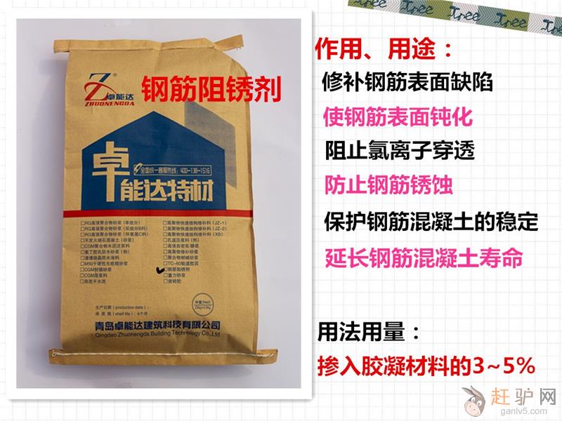 通过添加钢筋阻锈剂,它能促使钢筋表面产生一层 y-Fe2O3或Fe3O4为主要组成的氧化物钝化膜,并修补钢筋表面的缺陷,使整个钢筋被一层氧化物钝化膜所包裹,致密性稳定性很好,能阻止氯离子穿透,降低铁离子的游离速度,从而达到防锈目的来源www.ganlv5.com。