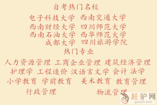 自考院校:西华师范大学、四川师范大学、西南石油大学、绵阳师范学院、成都理工大学、西南财经大学、电子科技大学、内江师范学院、乐山师范学院、西南交通大学。