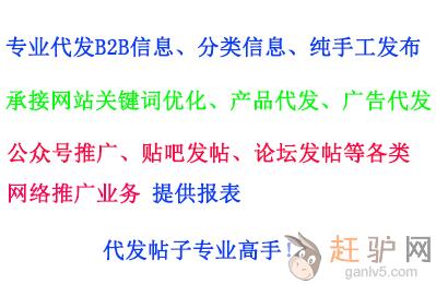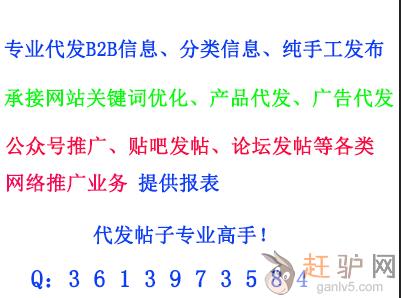 哪里有人工手工代发信息B2B信息代发,我们拥有专业的代发团队,为客户提供高效率的B2B平台信息代发、分类网站信息代发、代发产品、网站关键词优化推广、代发广告、公众号推广、贴吧、论坛代发,纯人工代发,提供报表,专业!效率!认真!欢迎咨询QQ:3613973584g~a~n~l~v~5~c~o~m欢迎www.ganlv5.com